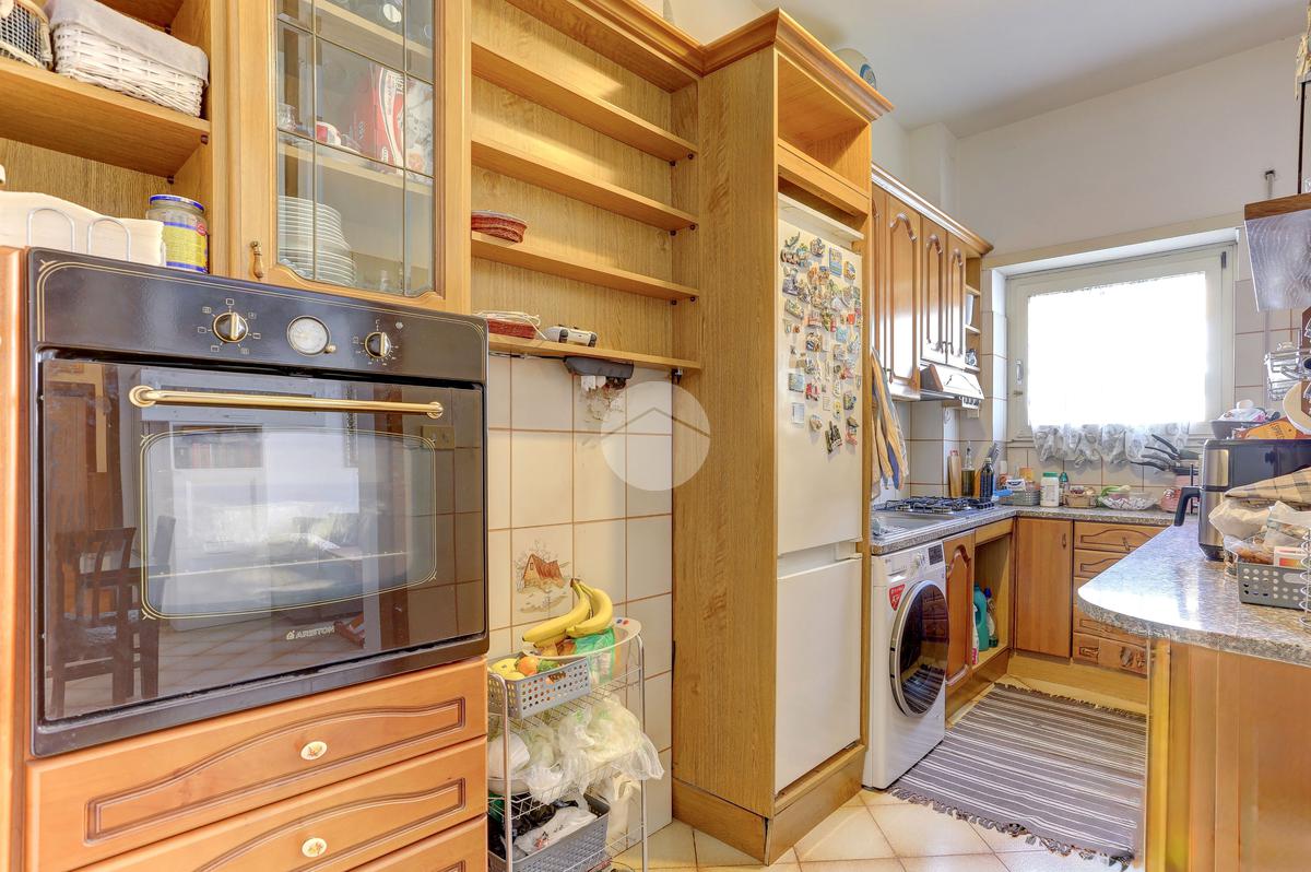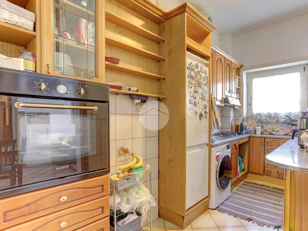 La cucina separata, funzionale e ben proporzionata, conserva il sapore delle case accoglienti di un tempo, ma si presta facilmente a una reinterpretazione moderna e pratica.