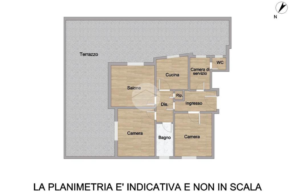 Entrando troviamo il salone e la cucina abitabile, entrambi con accesso diretto al vero protagonista della casa: un terrazzo di circa 130 mq, ampio e molto ricercato in zona, ideale per vivere l’esterno come prolungamento degli interni.